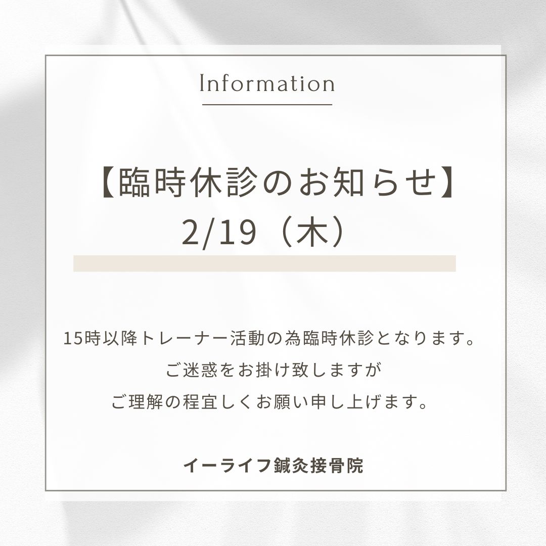 2月19日(木)15時以降トレーナー活動の為臨時休診となります。